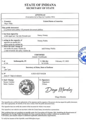 Apostilles on Indiana University diplomas and High School certificates are obtained from the Indiana Secretary of State upon presentation of the original certificate certified by an Indiana notary public. We can also obtain apostille stamps on good-quality scans of academic certificates and degrees by making notarized copies.Documents certified by an Indiana notary