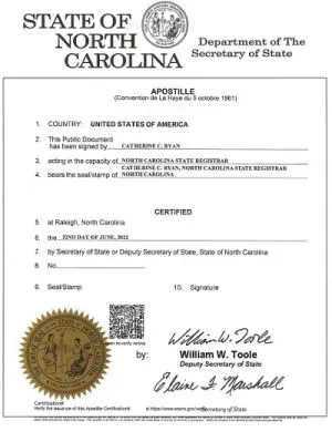 We provide expedited Apostilles for Birth, Death and Marriage Certificates certified by North Carolina Vital Records or a County Register of Deeds.
