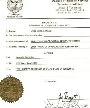 Tennessee divorce certificates and judgements can be certified with an Apostille when certified by a Tennessee court or issued by Tennessee Vital Records. For assistance obtaining certified judgements from Tennessee divorce courts, please Contact us.